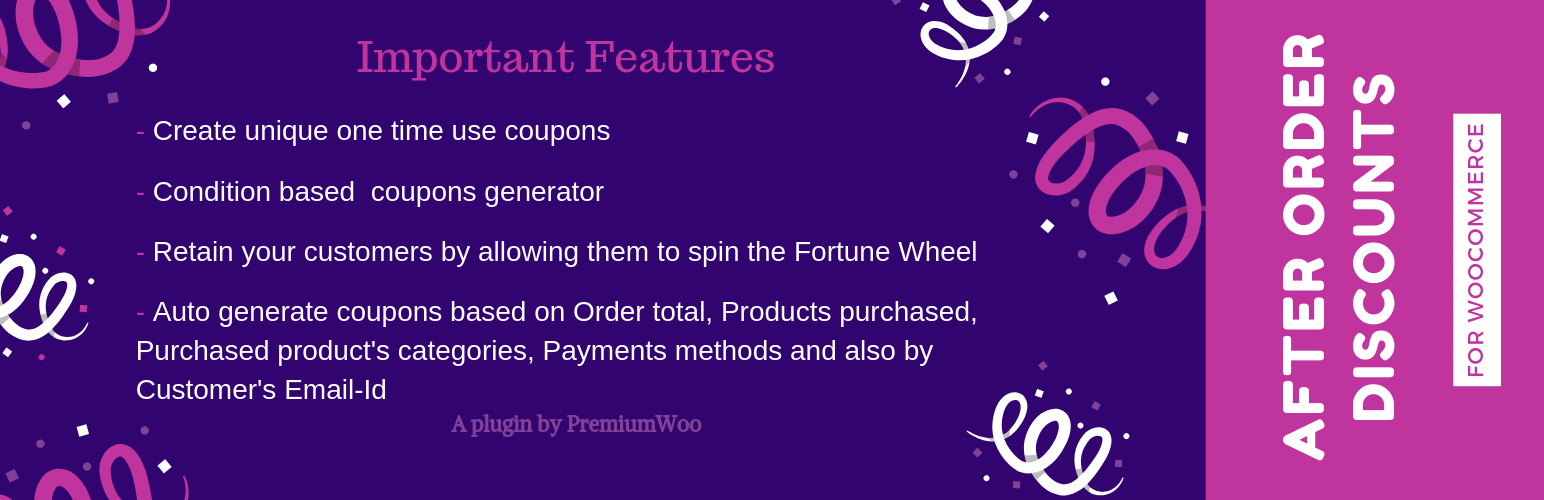 wordpress.org/plugins/after-order-discounts-for-woocommerceThis WooCommerce Coupon Plugin helps you to Create Discount Coupon Code for your Regular Customer. This plugin provides two ways to create coupon code …