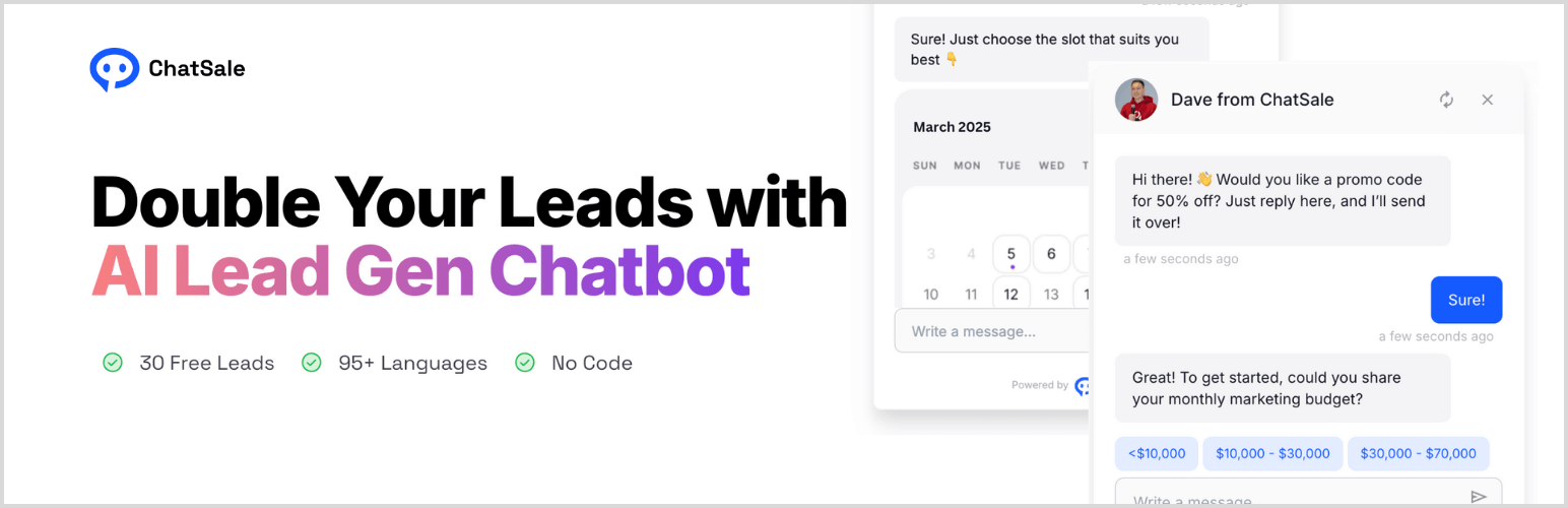 wordpress.org/plugins/ai-lead-form-builder-chatsaleChatSale is a ChatGPT chatbot for a website that turns website visitors into qualified leads and booked appointments through smart conversations.