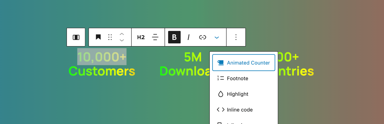 wordpress.org/plugins/animated-counterEasily animate numbers on the frontend by applying the Animated Counter format directly from the Gutenberg editor toolbar.