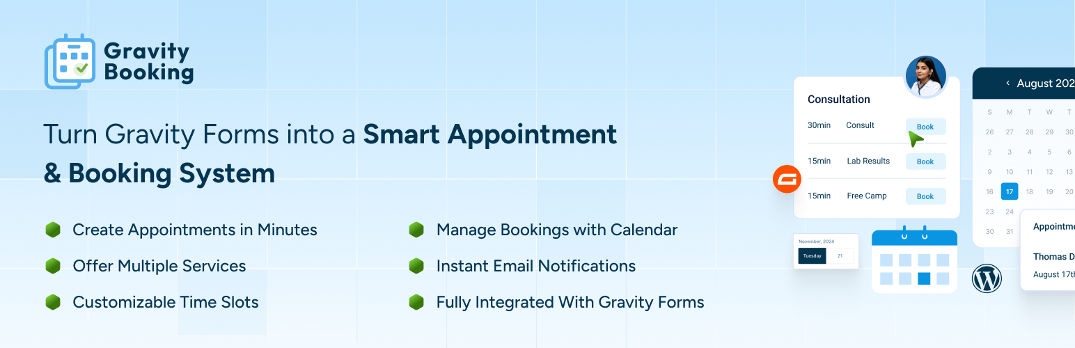 wordpress.org/plugins/appointment-and-booking-for-gravity-formsGravity Forms Booking is a Gravity Forms-powered appointment booking & scheduling plugin. It turns Gravity Forms into a complete appointment booki …