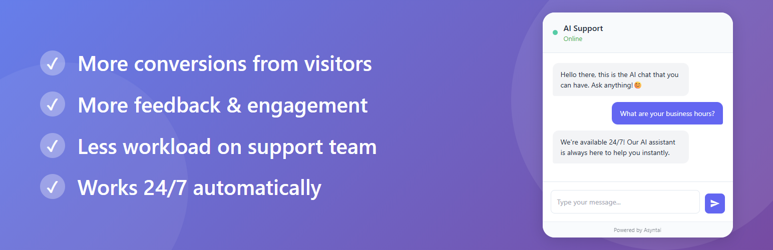 wordpress.org/plugins/asyntai-ai-chatbotAI assistant / chatbot – Provides instant answers to your website visitors.