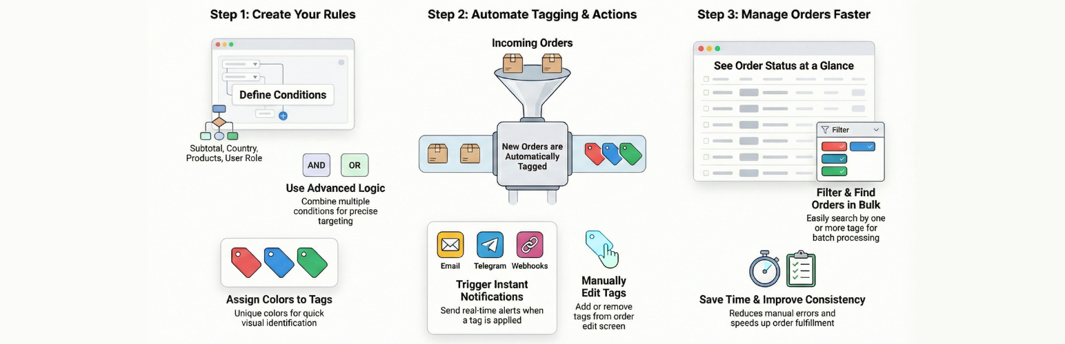 wordpress.org/plugins/auto-assign-order-tags-for-woocommerceThis plugin automatically tags WooCommerce orders based on custom rules to improve order management and efficiently manage order processing.