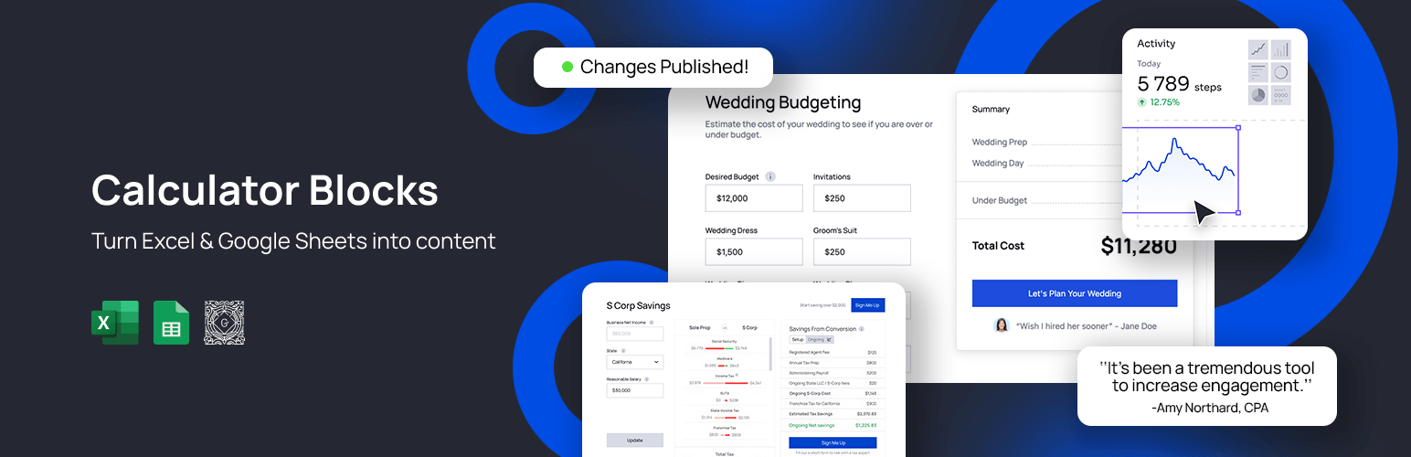 wordpress.org/plugins/calculator-blocksCalculator Blocks turns your Excel & Google Sheets into content. Personalize user results with forms and create mobile friendly visualizations.