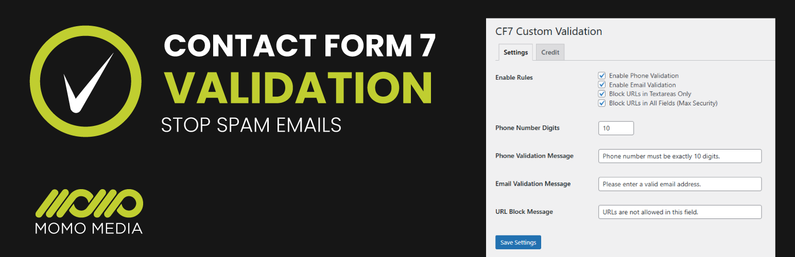 wordpress.org/plugins/custom-validation-for-cf7Advanced validation for Contact Form 7: block URLs, validate phone and email, with admin settings.