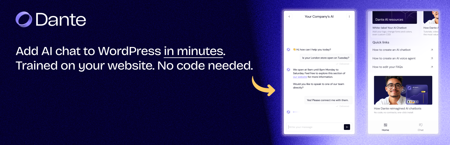 wordpress.org/plugins/dante-aiAdd a helpful AI chatbot to your WordPress site in minutes - boost engagement, answer questions, and turn more visitors into customers.