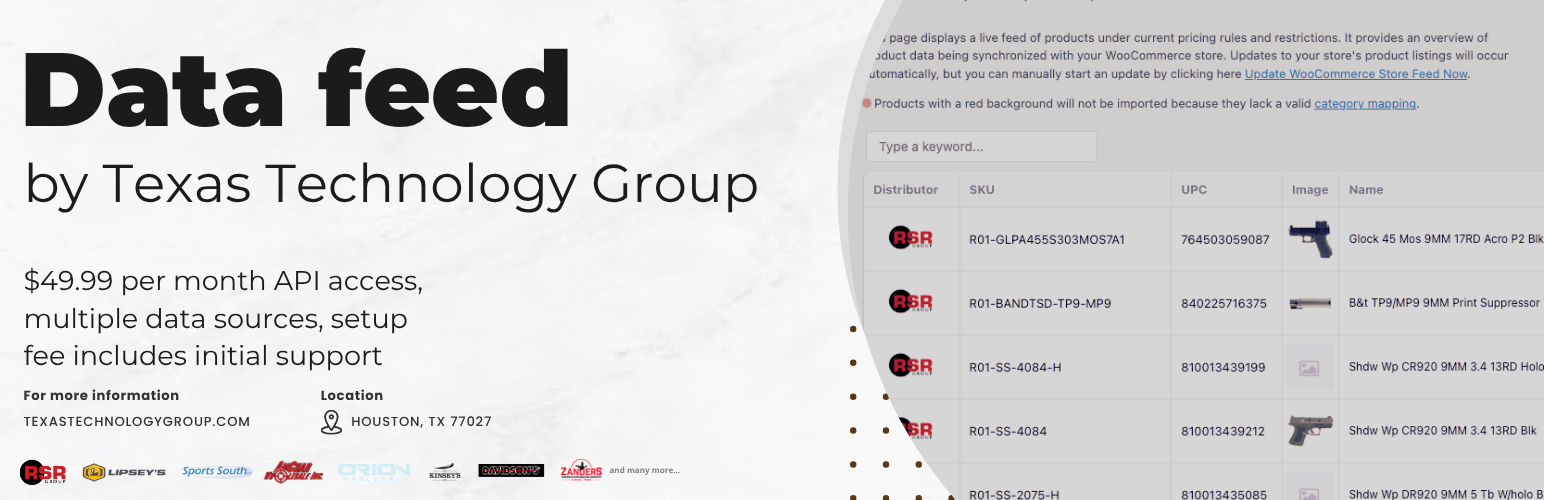 wordpress.org/plugins/data-feed-by-ttg-for-woocommerceReal-time firearm data feed for WooCommerce with support for RSR, Zanders, Sports South, Lipseys, Davidsons, and more.