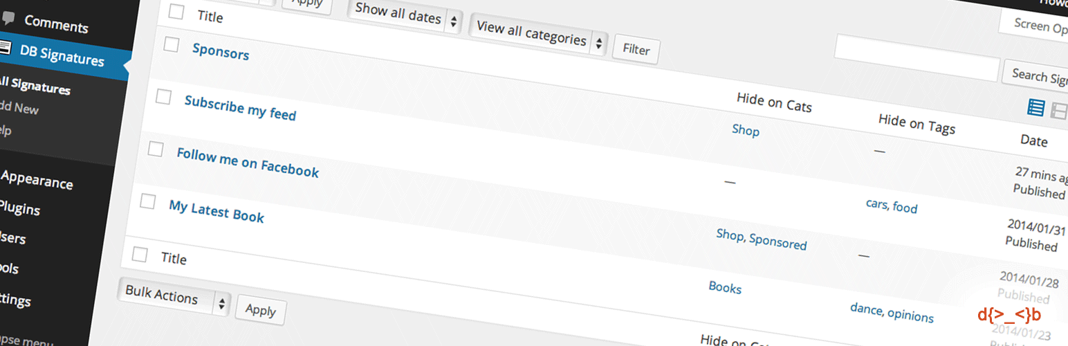 wordpress.org/plugins/db-signaturesAdd some HTML content to the bottom of every posts, pages and custom post types.
