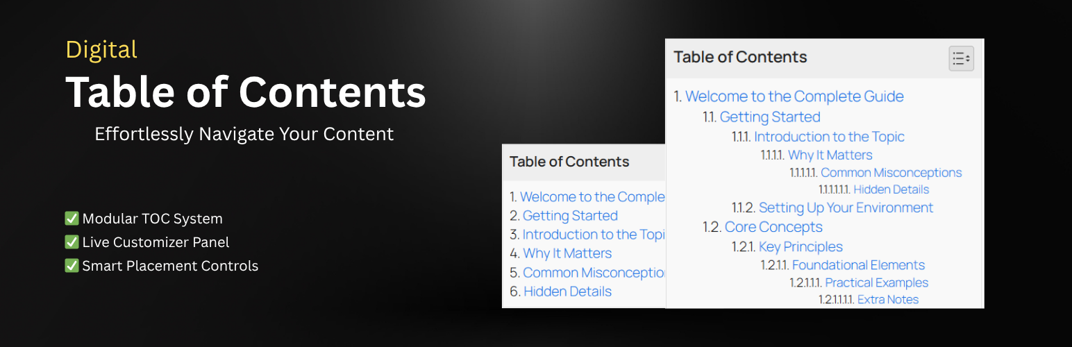 wordpress.org/plugins/digital-table-of-contentsA powerful and customizable TOC plugin. Effortlessly navigate your content with advanced features and flexible styling.