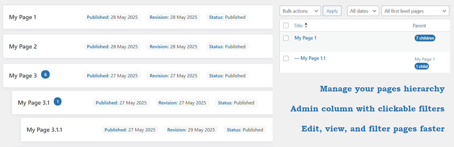 Nested Pages provides a drag and drop interface for managing pages & posts in the WordPress admin, while maintaining quick edit functionality.