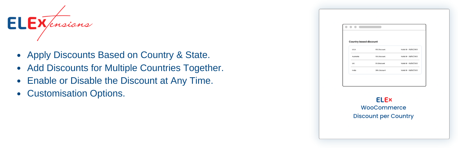 wordpress.org/plugins/elex-discount-per-countryIt will be a pleasant little surprise for customers if you offer a discount based on the shipping state/country they have chosen on the Checkout page.