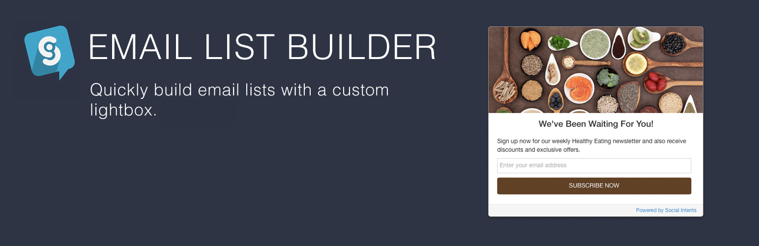 wordpress.org/plugins/email-list-builder-by-social-intentsList Builder is the easiest way to double your email subscribers. A lightbox that integrates with MailChimp, Campaign Monitor, Constant Contact.