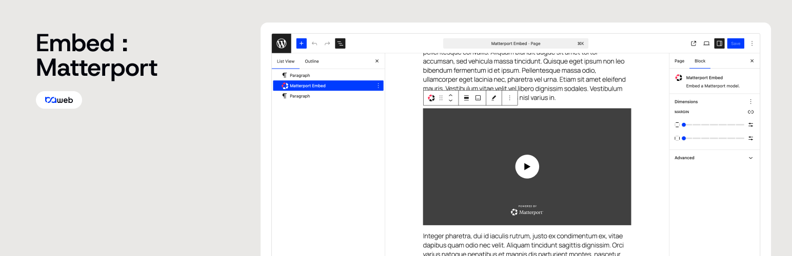 wordpress.org/plugins/embed-block-for-matterportAdds Matterport oEmbed support and provides a new Embed block variation.