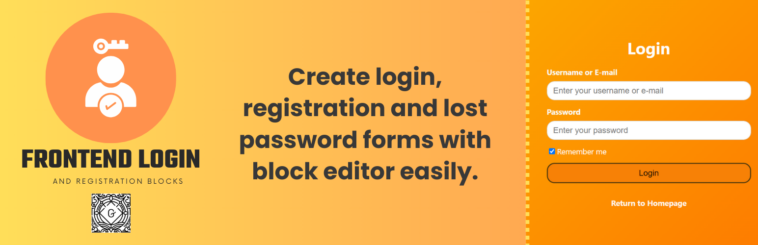 wordpress.org/plugins/frontend-login-and-registration-blocksLogin, Registration and Lost Password Blocks plugin provides blocks helps you to add login, register, lost password forms from front end.