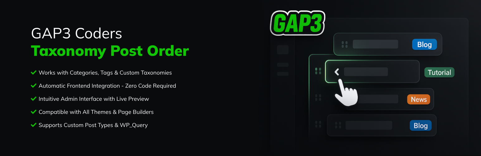 wordpress.org/plugins/gap3coders-taxonomy-post-orderEasily reorder posts within taxonomy terms using drag-and-drop interface. Custom order automatically applies to frontend without any code changes.