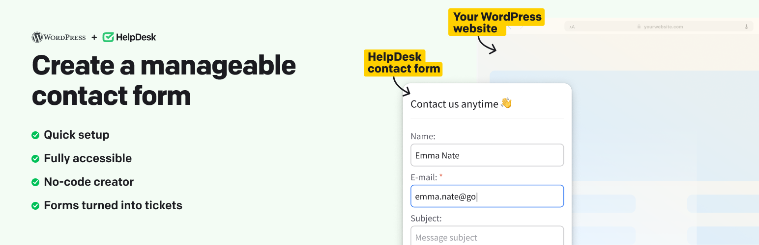 wordpress.org/plugins/helpdesk-contact-formUse the WordPress contact form plugin by the HelpDesk ticket system to connect with visitors. Organize and manage messages — all without coding!