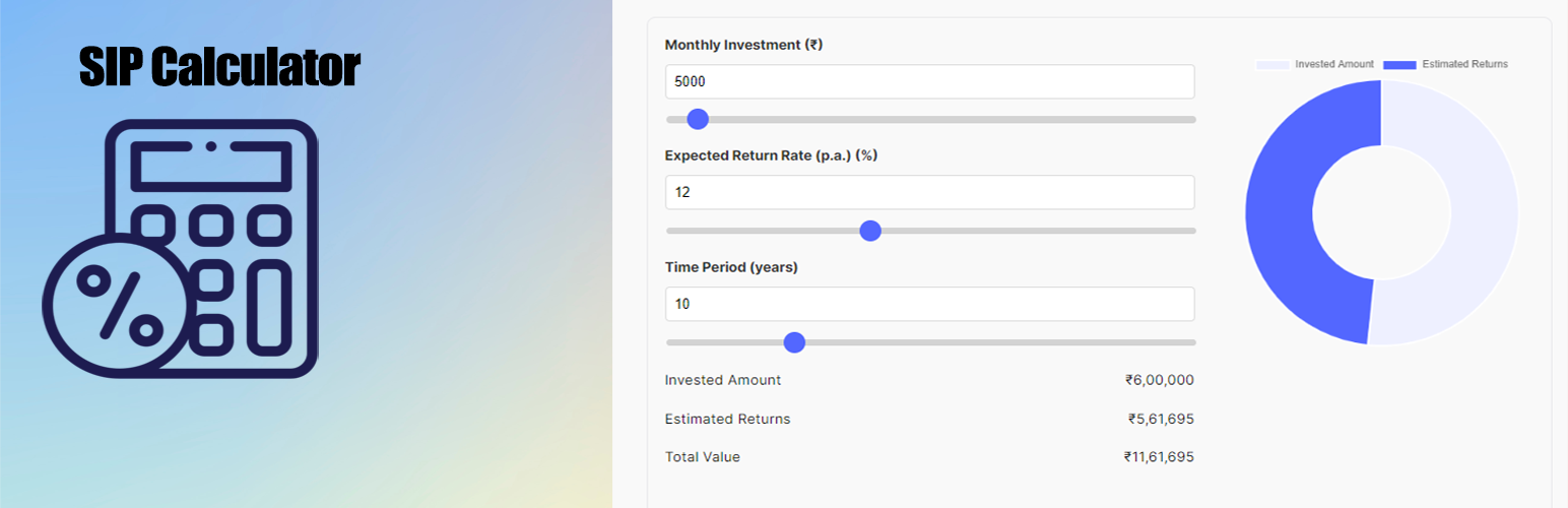 wordpress.org/plugins/kp-sip-calculatorA SIP Calculator with customizable default values for Monthly Investment, Expected Return Rate, and Time Period.