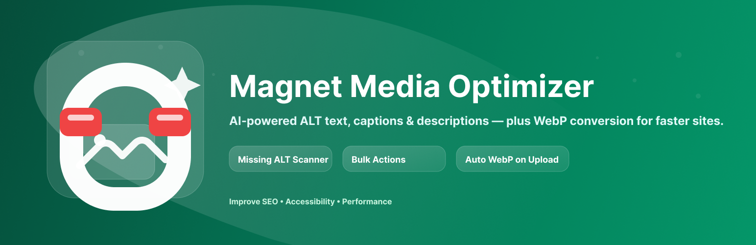 wordpress.org/plugins/magnet-media-optimizerAI-powered image enhancement: automatic ALT text, captions, and descriptions for images, plus WebP conversion for faster performance and improved SEO.