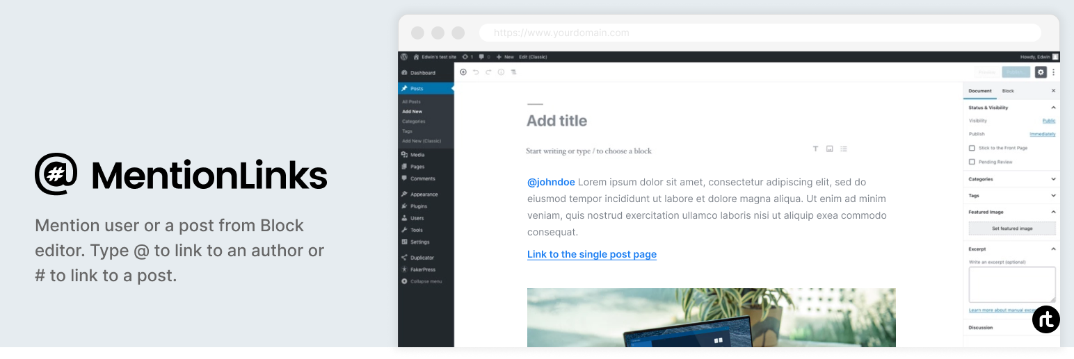 wordpress.org/plugins/mention-linksThis plugin lets you mention a user or a post (including Custom Post Types) in post content from the block editor. Type @ to link to an author or # to …