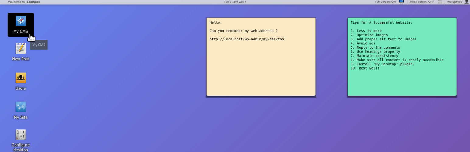 wordpress.org/plugins/my-desktopManage your site from a web desktop. Do multitasking with windows, click icons, use notes. Jump to any place in your wp-admin quickly.