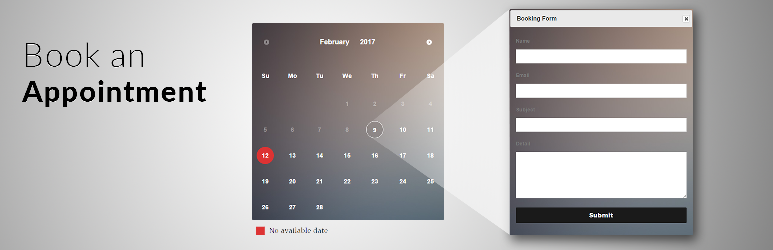 wordpress.org/plugins/podamibe-appointment-calendarDisplay your appointment,availability,book date on calendar with various layout and form in more easier and quicker way.
