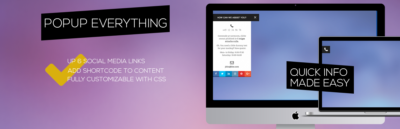 wordpress.org/plugins/popup-everythingPopUp Everything is a pop-up plugin, that allows you to quickly and easily show your visitors important info such as contact info.