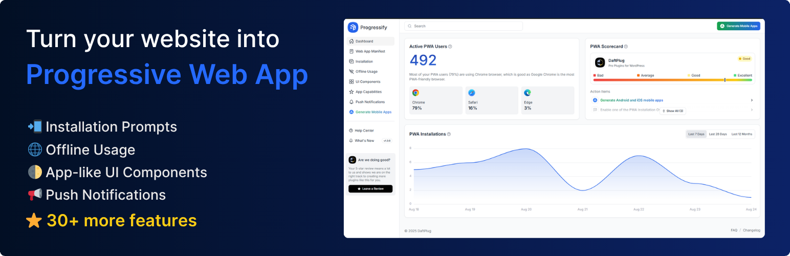 wordpress.org/plugins/progressifyTurn your site into an app-like PWA with install prompts, offline use, push notifications, and more to boost engagement, repeat visits, and sales.