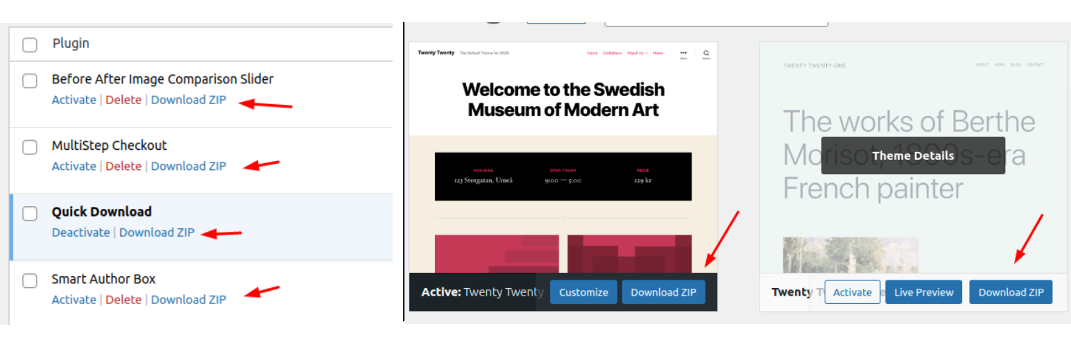 Download any installed plugin or theme as a ZIP file directly from your WordPress dashboard.