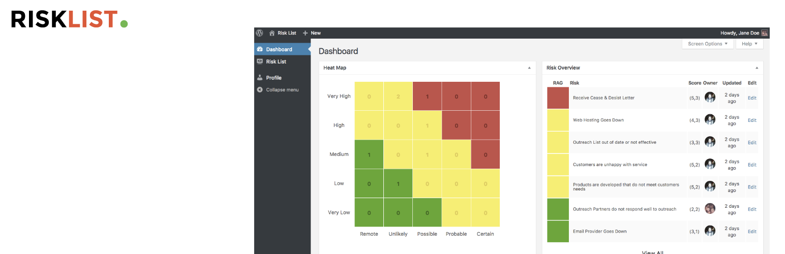 wordpress.org/plugins/risk-listRisk List brings Risk Management into your WordPress Dashboard. Manage your risks. Track your Metrics. Grow big.