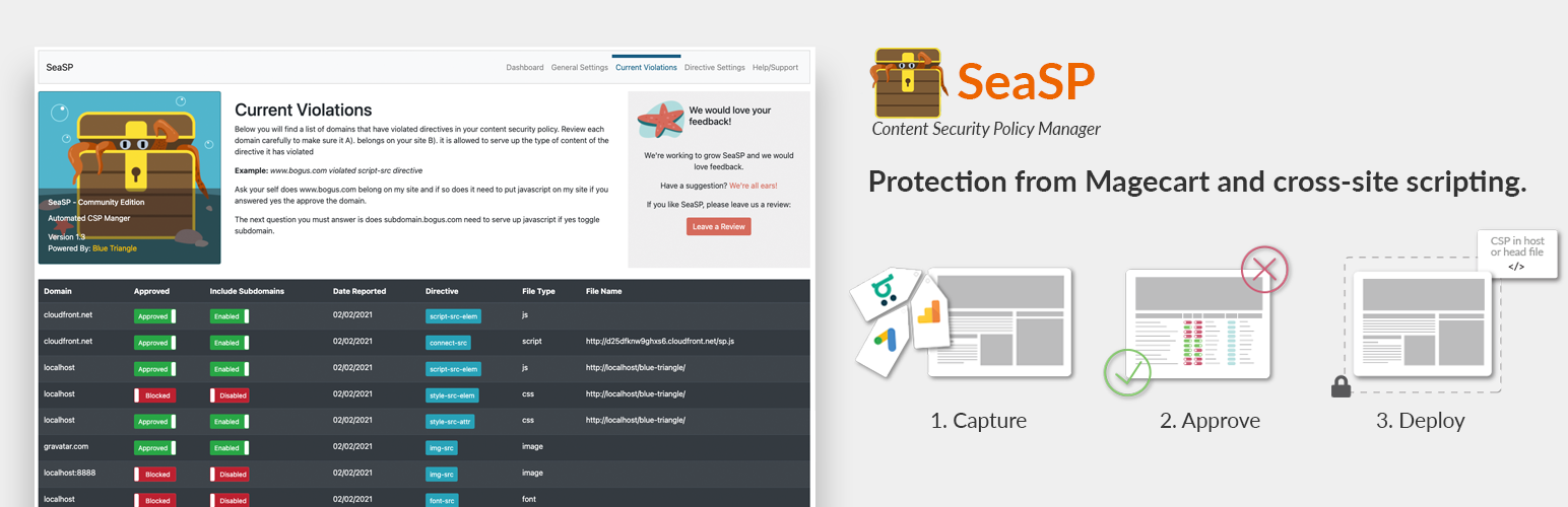 wordpress.org/plugins/sea-sp-community-editionSeaSP Community Edition is an automated Content Security Policy Manager. SeaSP allows you to create, configure, manage, and deploy a Content Security …