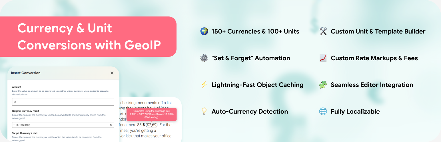 wordpress.org/plugins/smart-convert-currency-unit-conversionThe ultimate conversion engine: 153 Currencies, 105+ Units, Custom Unit Builder, GeoIP detection, and a native Gutenberg Block with live previews.