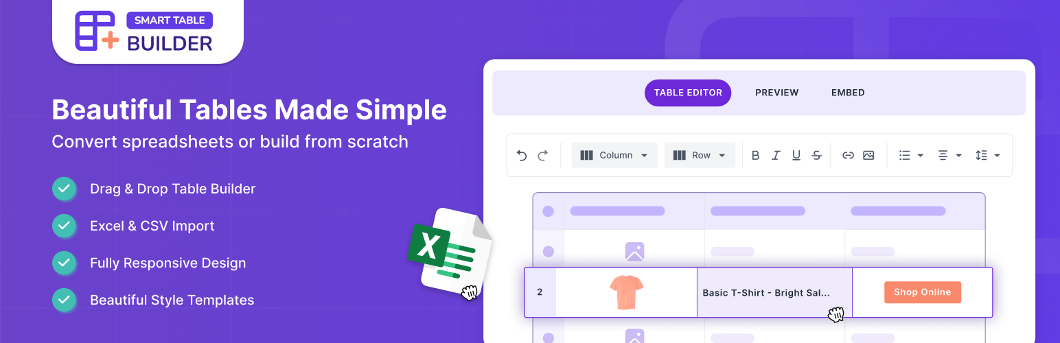 wordpress.org/plugins/smart-table-builderCreate beautiful, responsive HTML tables from scratch or convert Excel and CSV files into WordPress tables effortlessly.