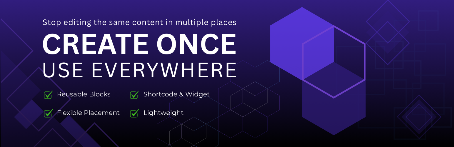wordpress.org/plugins/snap-blocksCreate and manage repeatable content blocks with Elementor or WPBakery. Insert them via shortcode or widget. Flexible and easy to use.