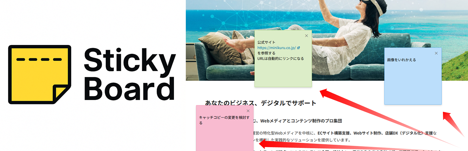 wordpress.org/plugins/stickyboardログインユーザーがWebページに付箋を追加できるようにするプラグイン。Create personal sticky notes on any WordPress page.