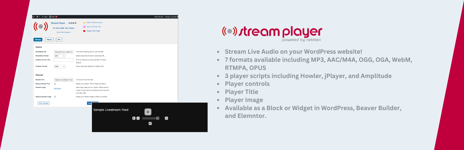 wordpress.org/plugins/stream-playerFree, open source streaming audio player plugin by netmix®. Works with Icecast, Shoutcast, and Live 365 streams. For additional features, upgrade to S …