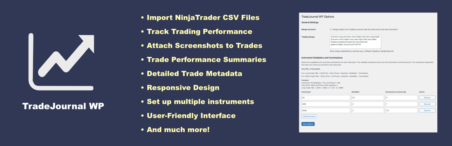 wordpress.org/plugins/tradejournalA trade journal plugin for WordPress to import, manage, and analyze NinjaTrader CSV trade data with detailed daily logs and performance summaries.