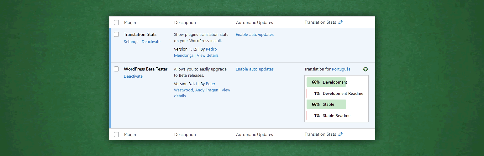 wordpress.org/plugins/translation-statsShow plugins translation stats on your WordPress install.