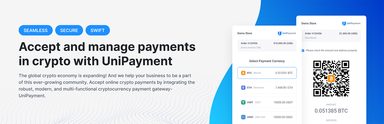 wordpress.org/plugins/unipayment-gateway-for-woocommerceThis plugin implements a payment gateway for WooCommerce to let buyers pay with Bitcoin, Ethereum, USDT, and other cryptocurrencies via UniPayment.io.