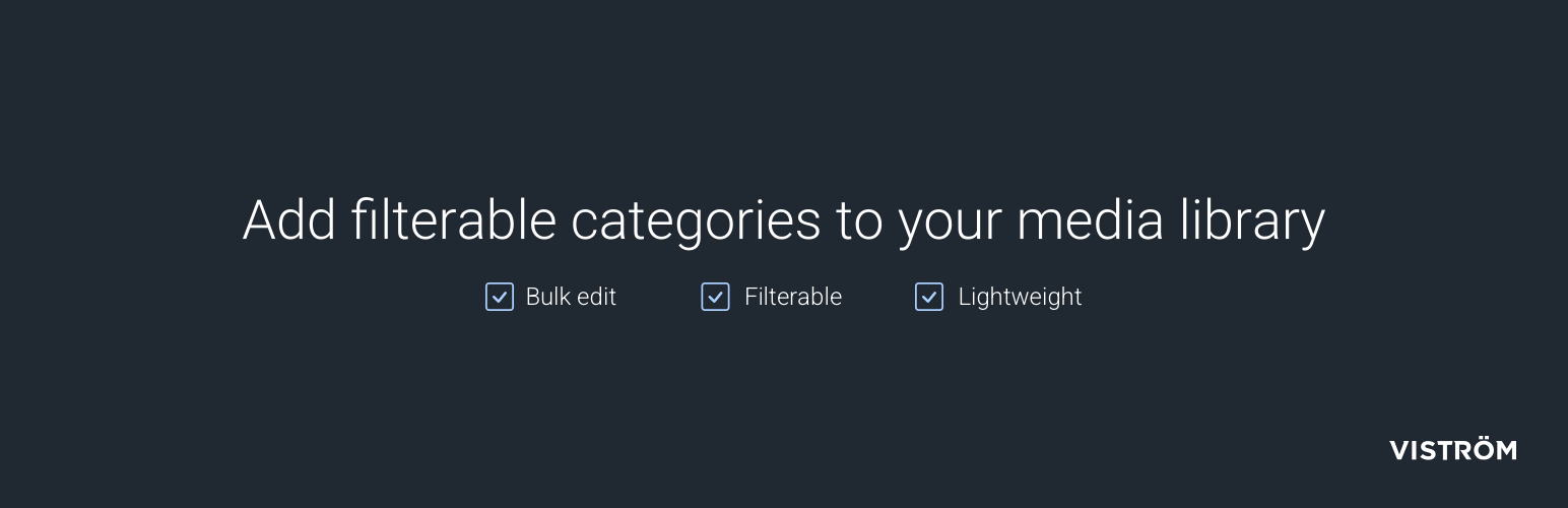 wordpress.org/plugins/vistrom-media-library-categoriesCategorize and filter your media library by categories, added support for bulk editing in both list-view and the grid-view.