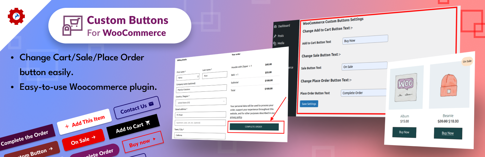 wordpress.org/plugins/wc-custom-buttonsCustom Buttons for WooCommerce is a simple plugin to customize your store’s add to cart, place order, sale buttons. It makes it easy to change the ‘Ad …