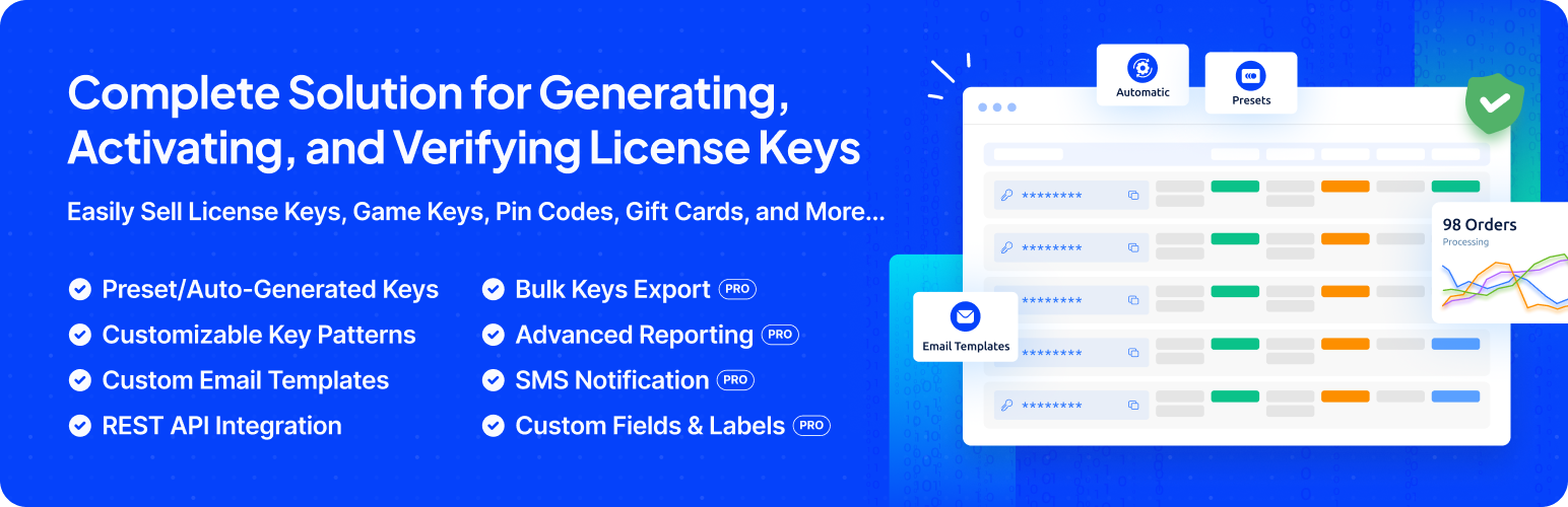 Sell license keys, serial numbers, and gift cards for Simple and Variable WooCommerce products with automatic assignment and secure storage.
