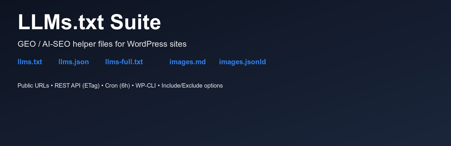 wordpress.org/plugins/webdigit-llms-index-suiteGenerate llms.txt, llms-full.txt, llms.json and AI-ready image indexes (Markdown + JSON-LD). Public URLs, REST API (ETag), cron and WP-CLI included.