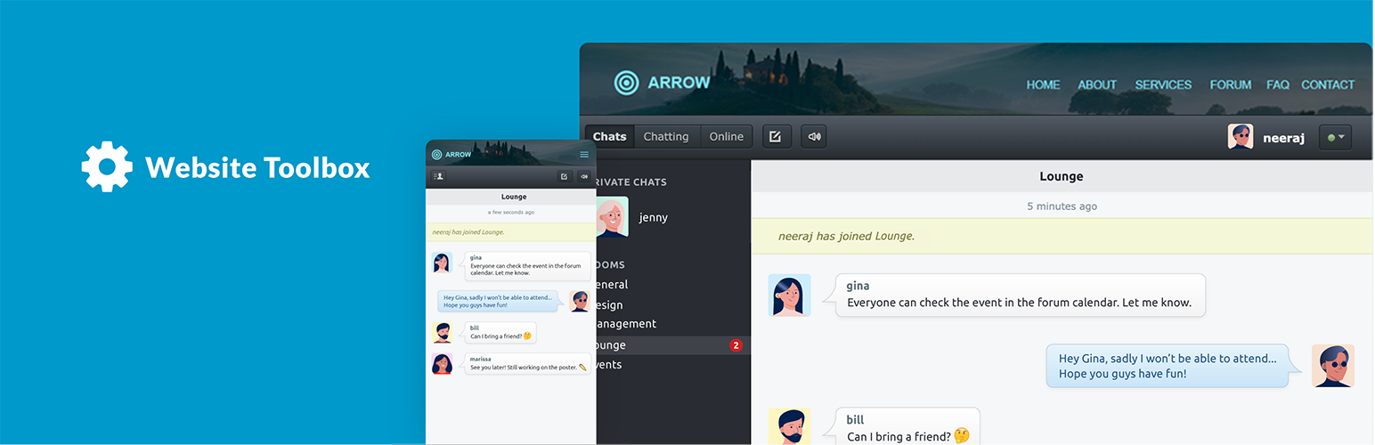 wordpress.org/plugins/website-toolbox-chat-roomsWebsite Toolbox is the easiest way to create a powerful Chat Room. This plugin embeds your Website Toolbox Chat Room and integrates single sign on.