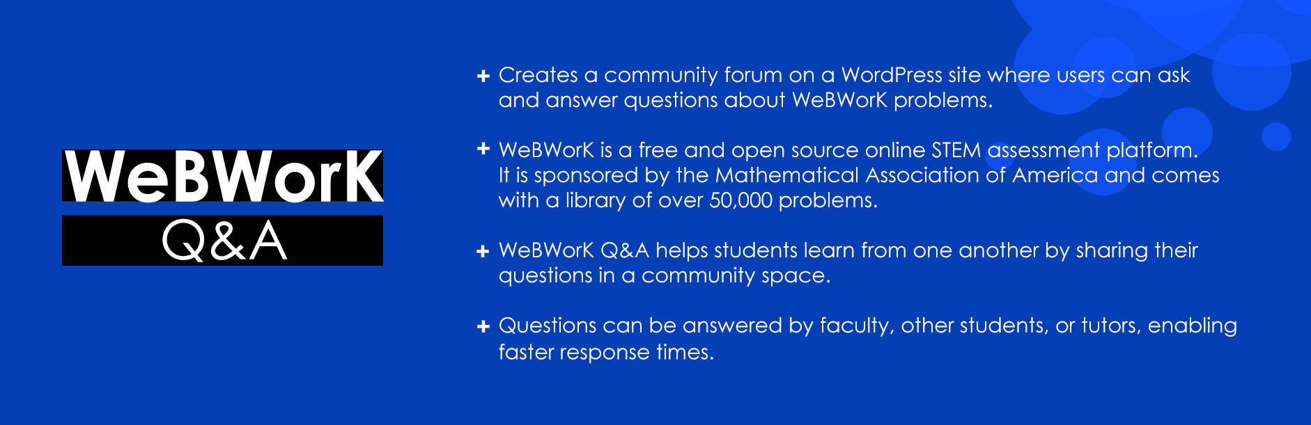 wordpress.org/plugins/webworkqaWeBWorK Q&A creates a community forum where users can ask and answer questions about WeBWorK problems.
