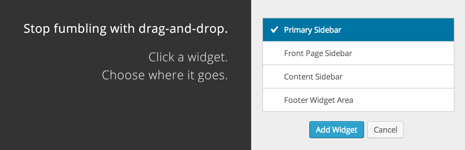 wordpress.org/plugins/widget-area-chooserDragging and dropping widgets into sidebars can be tricky. This plugin lets you click a widget, and then choose where it should be placed. Simple.