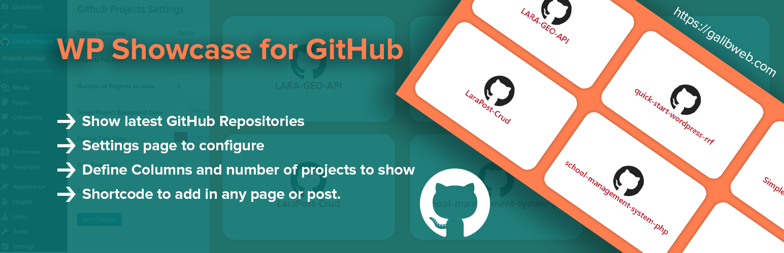 wordpress.org/plugins/wp-showcase-for-githubDisplay Your GitHub Projects on your WordPress website using a simple shortcode. This plugin comes with rich settings page where you can configure eve …