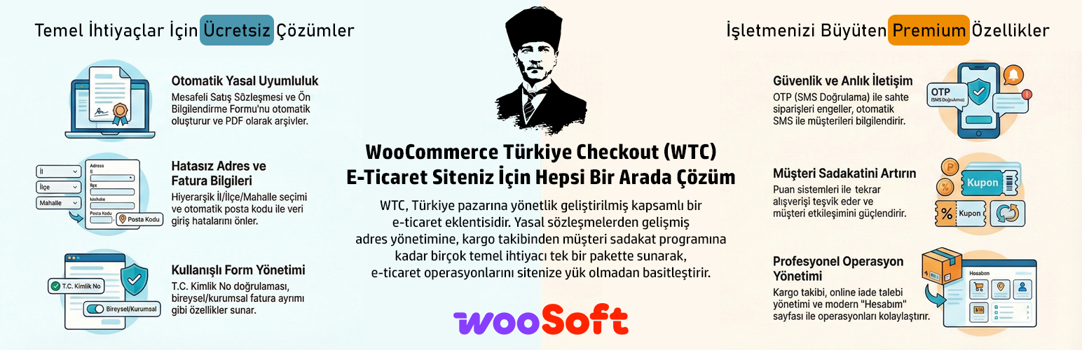 wordpress.org/plugins/wtc-checkoutWC Turkiye: Contracts, Form Fields, District/Neighborhood Select, Auto Postcode, Cargo, SMS, OTP, Points, Coupons, Return and Dashboard Management.